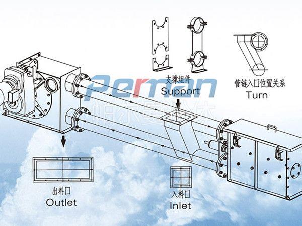 管鏈輸送機在輸送物料過程中,具有埋刮板輸送機輸送能力大,使用壽命長、維修費用低,密封性好,安全,耗能低的特點,也具備斗式提升機的垂直輸送的能力,同時布置更為靈活(水平-垂直/傾斜-水平),密封性能更高。物料垂直輸送中無回料,不破壞物料,不揚塵的特點。在輸送含水物料、易吸附物料、比重很輕的物料時,在機箱內可安裝電動清掃器。